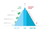 Elke stap in het productieproces van een product voegt waarde toe, vanaf het delven van de materialen tot het assembleren van de onderdelen. Dit ziet u ook in de afbeelding van de Value hill rechts. Het product staat hoger op de Value hill (piramide) dan het materiaal. De waarde van het product is dus hoger dan de waarde van het materiaal.