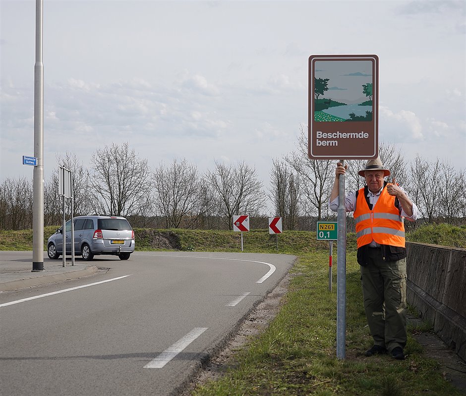 Het Beschermde Berm-bord stond enkele weken langs de oprit naar de A65 in Oisterwijk. Een trigger voor passerende automobilisten om bewuster om te gaan met de welbekende groene strook langs de weg. Het bord is ontwikkeld door een team creatieven en gedragsexperts van bureau Fama Volat. Frans Kapteijns, vrijwillig boswachter voor Natuurmonumenten en ZwerfAfvalPakker, is ambassadeur van de eerste Beschermde Berm en beaamt: 'Het wordt tijd dat de berm, het leefgebied van veel planten en dieren, niet langer een dumpplek is voor allerlei soorten zwerfafval. Die bewustwording breng ik graag mee op gang.'